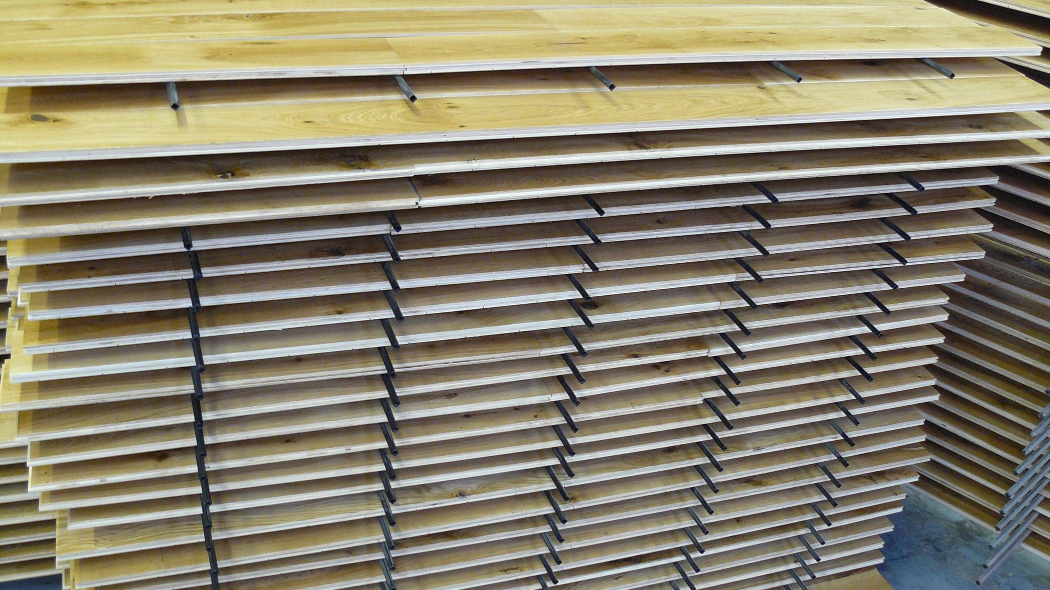 Wooden flooring on drying racks